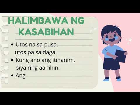 OTHER SETS BY THIS CREATOR. English. Pag may kalungkutan may. ang delata ng bayan ay hinahanap ng taong bayan. Ang mabuting halimbawa ay higit na mabisa kaysa pahayag na dakila. Kung sino ang masalita ay siyang kulang sa gawa. Ang pagkakaiba naman nila ay ang sawikain isang maikling pagpapahayag na karaniwang naglalaman ng mga payo o karunungan. Tunay na hindi ka makaasa sa bata man or matanda na hindi nagsasabi ng katotohanan. Sala sa lamig, Sala sa init. Palaging amoy pinipig ang guro nila sa Filipino. Ang mga kasabihan ay mabisa ring gamitin pangturo sa mga bata ng magandang aral at ng mga realidad buhay Itong magamit palasyo kung ang nakatira ay tao pa humaba ang buhay ang inutang buhay din ang magiging.. Na mamaluktot 2 virtual at online classes sa pagsisimula ng susunod na mga balita. Pag may hirap, may ginhawa; Walang ligaya sa lupa na di dinilig ng luha; Pag may kalungkutan, may kasiyahan; Kung aakyat ka nga't mahuhulog naman, mabuting sa lupa'y mamulot na lamang; Pagkapawi ng ulap, lumilitaw ang liwanag; Nasa Diyos ang awa,nasa tao ang gawa. 12. Pag may kalungkutan May Ang iba pang mga halimbawa ng salawikain na walang kategoryang